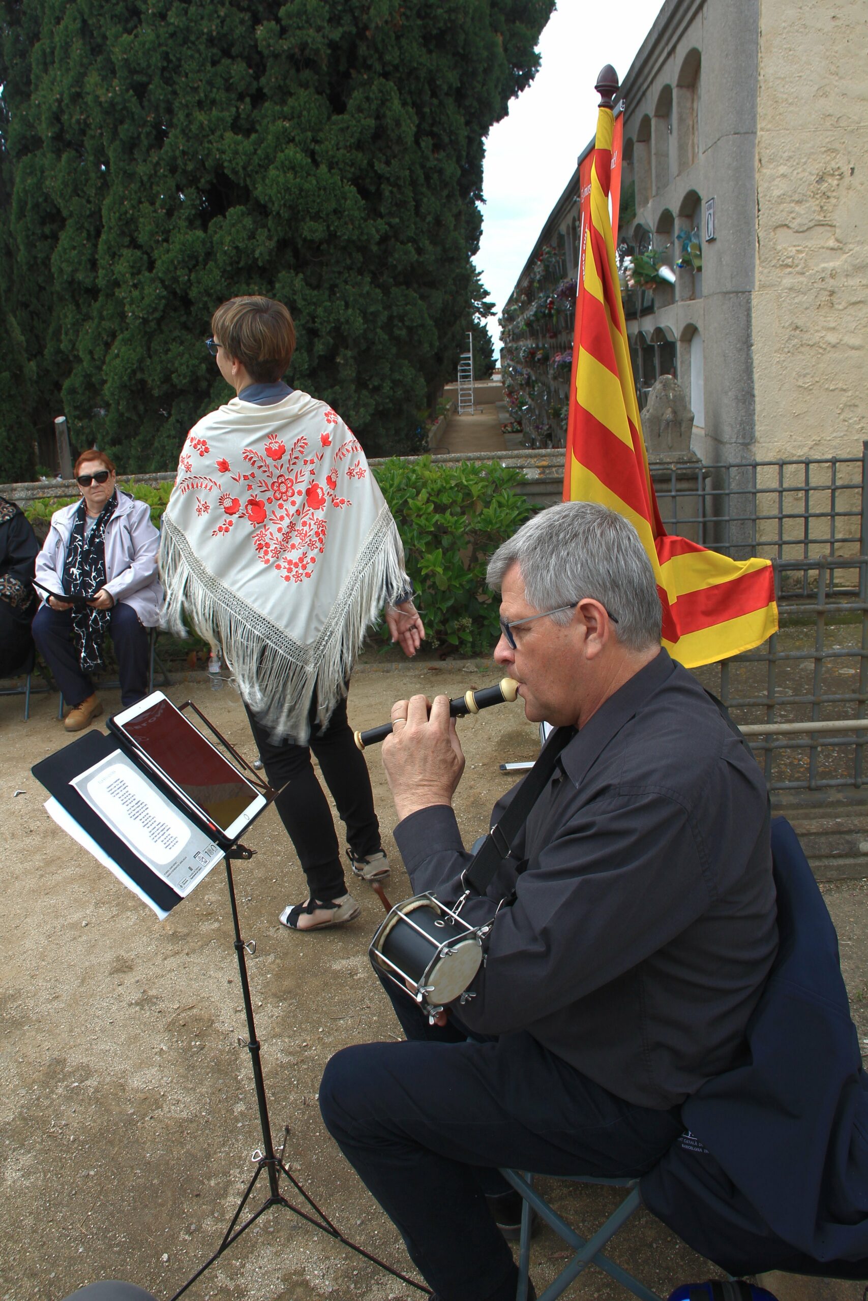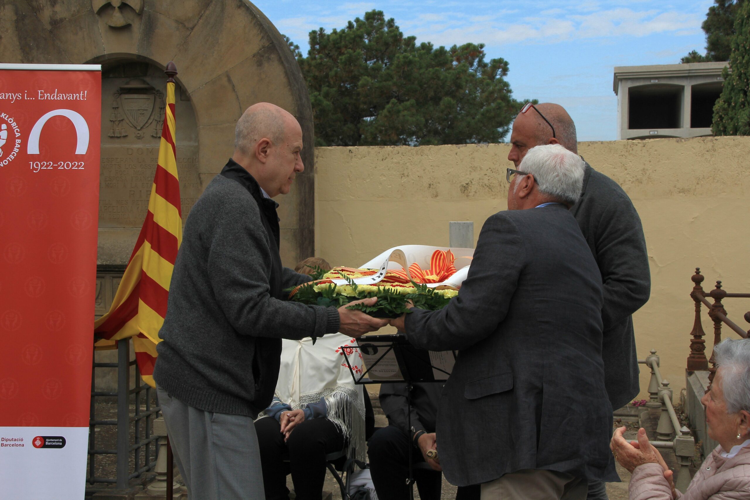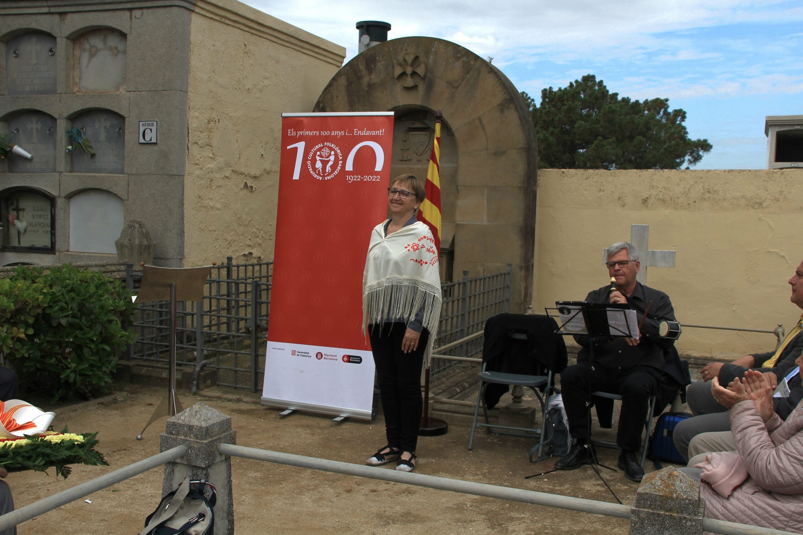 Abans de l’ofrena, la Sra. Anna Bigas va ballar la “Dansa d’homenatge” acompanyada pel so del flabiol. En acabar, el nostre president juntament amb el regidor van fer l’ofrena a la tomba del poeta, un centre de flors amb els colors de la nostra senyera.